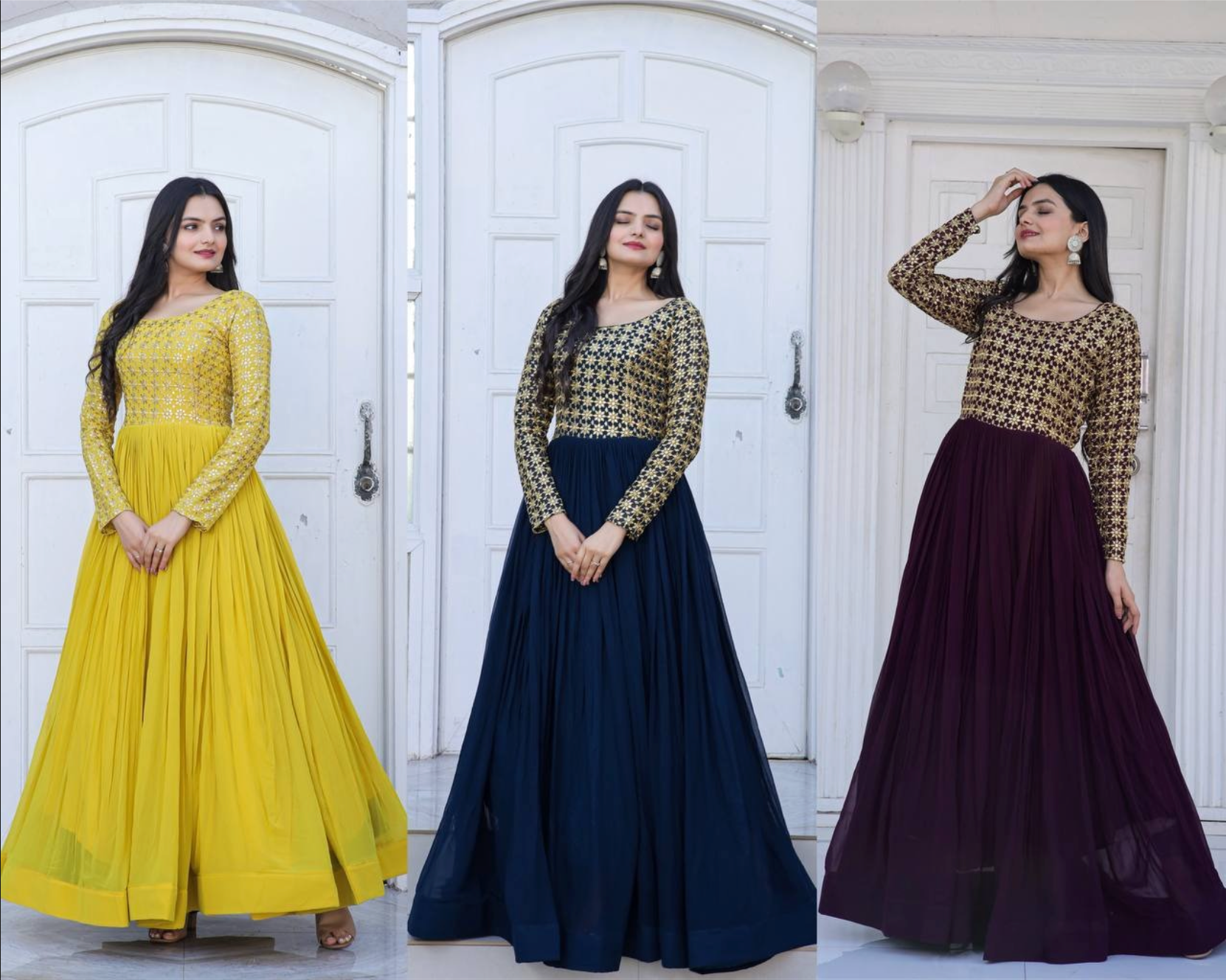 Make every occasion unforgettable with our Faux Blooming Embroidered Gown, featuring exquisite multi-sequins and zari work, crafted for graceful flair and festive charm.