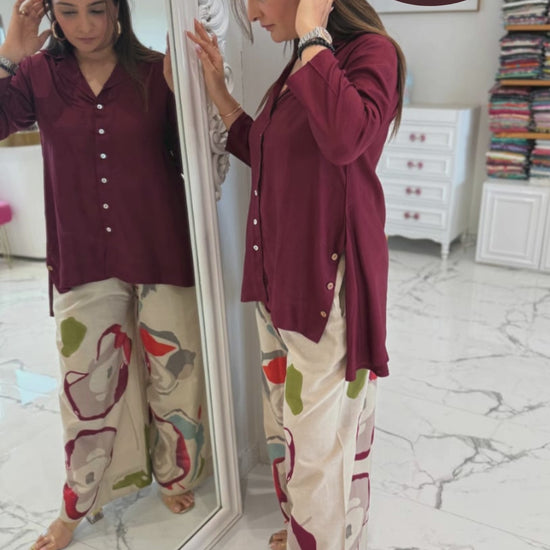 Rich Colour Combo – Elegant Meroon Top paired with Chiku Multicolour Plazo.